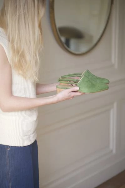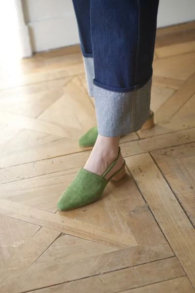 Retour gratuit en France (hors promotions) Chaussant normal. Prenez votre taille habituelle. Cuir velours vert avocat tartaruga Issu des meilleures tanneries italiennes Doublure chèvre, couleur naturelle légèrement rosée Semelle cuirFabriqué mains dans la région de l’Aveiro au Portugal Talon bois 4 cmVous avez une question ? Contactez-nous : [email protected] — Fit true size. Please select your normal size Green avocado tartaruga suede leather From the best Italian tanneries Goat leather lining, light natural pink Leather soleHandmade in Aveiro district, Portugal Wood heel 4 cm USA – Taxes and duties free (under 800$ of purchase)