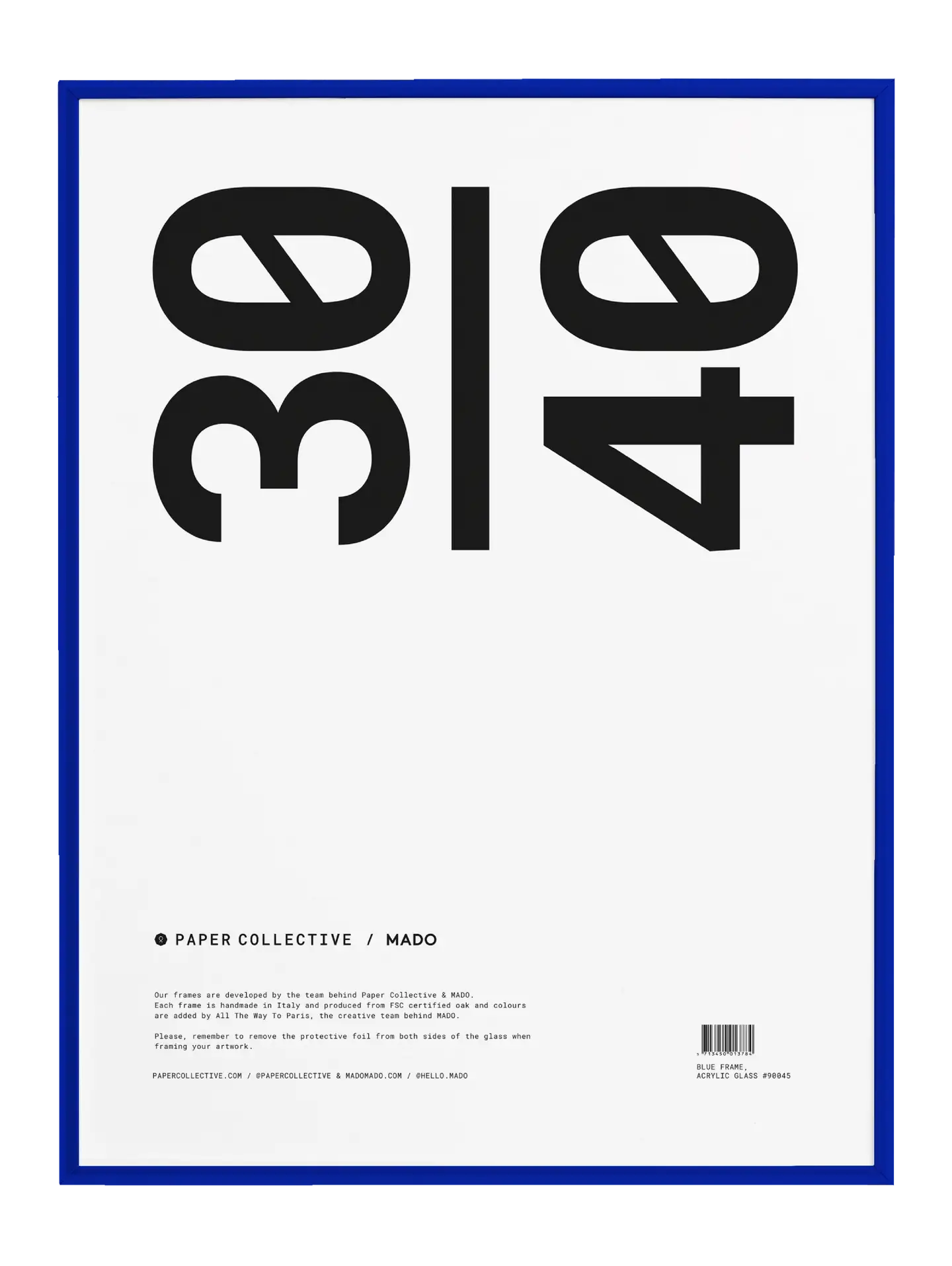 Ready-made frame in solid oak with acrylic glass that looks like regular glass, but makes it great for shipping without any damages. Remember to remove the protective film of the glass when framing your artwork.